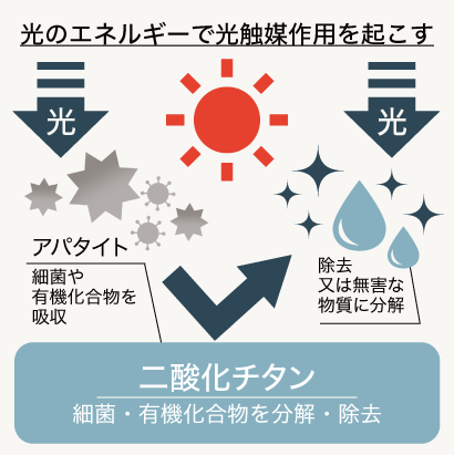 一方COAT-F(コートエフ)は、光を必要としない“無光触媒"ですが、「リン酸チタニア」とよばれる化合物が菌やウイルス、悪臭の成分と結合することにより無毒化するので、光(紫外線)を必要としません。