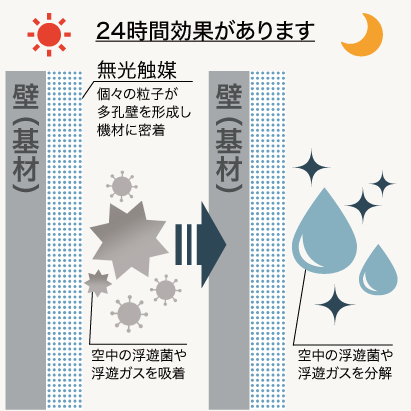 太陽光照射によって効果を発揮する光触媒とは違い、菌、ウイルス、臭いの元の物質が施工した無光触媒に触れるだけで分解され効果が発揮されるので、今までは触媒の施工が無意味だった、光を全く必要としない暗所にも施工が可能、効果を期待することができます。