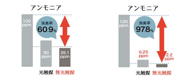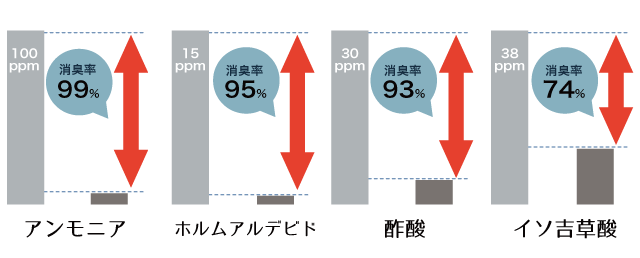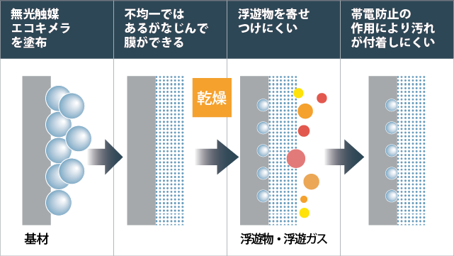 触媒効果により、エコキメラを塗布した空間を臭いの元から効果を発揮。ホルムアルデヒド、やシックハウスの原因VOC(揮発性有機化合物)、アンモニア等、無光触媒エコキメラの特徴、光のない暗所においても効果を発揮するので、住空間を夜や、お仕事でお部屋を留守にしている間も、オフィスや店舗であれば、営業、稼働していない間も、24時間休まず触媒効果を発揮し続けます。