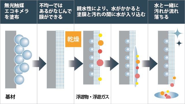 一度の施工で長期に渡り効果を維持し続けるのでコストパフォーマンスにも優れた、光触媒の先を行く、次世代の触媒コーティングです。