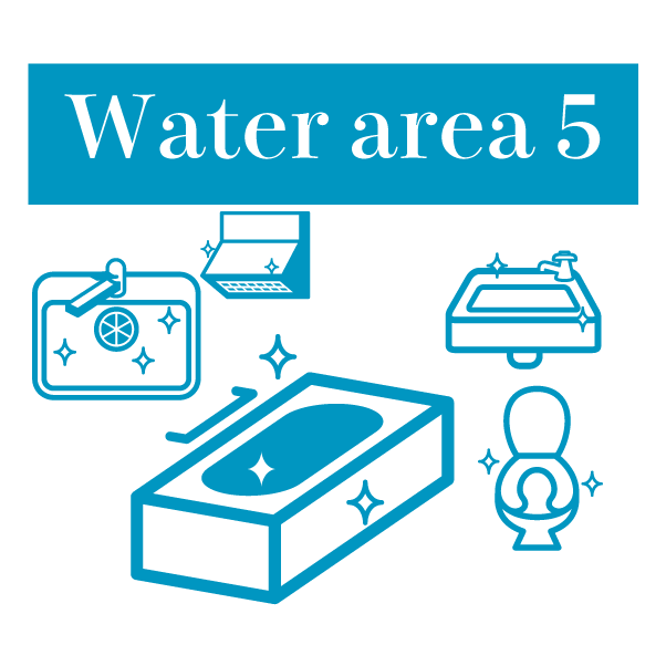 水まわり全てに施工をご希望場合は「水まわり5点パック」がお得です。抗菌・抗ウイルス・消臭効果の(S)で全体を施工し、カビの気になるバスルームや洗面所、キッチンにはポイントで防カビコーティング(F)、油汚れが気になるレンジフードには防汚コーティング(C)を施工いたします。